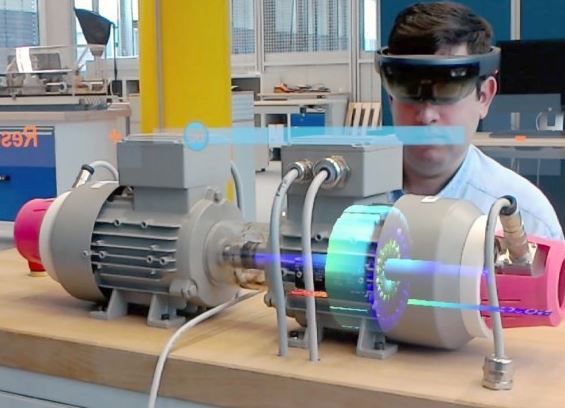 透过增强现实头盔来观看电机演示器,佩戴者可以看到电机及其内部的逼真模拟,以及叠加于其上的真实演示器。