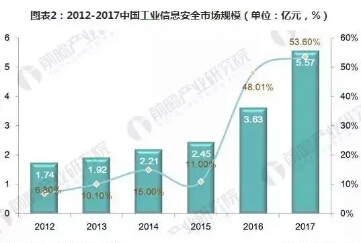 目前工业领域在信息安全方面的投入仍然以传统IT信息安全为主,针对工业控制系统信息安全的投入仅占10%左右。2012年-2014年,中国工业信息安全市场规模增长率只有10%左右,2015年开始快速增长,2017年中国工业信息安全市场规模为5.57亿元,同比增长53.60%。2017年中国信息安全市场规模约为419.1亿元,中国工业信息安全市场规模占为1.33%,市场规模较小。由于工控系统的复杂性特殊性,传统的IT信息安全系统无法对工业信息安全进行有效防护。此外中国专注工业信息安全领域的厂商普遍规模较小,布局工业信息安全业务的传统信息安全厂商、自动化厂商和IT系统集成商进入市场的时间多数不足五年,导致工业信息安全行业集中度不高,缺乏龙头企业,产品竞争力不强。