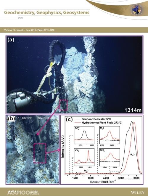 近日,中国科学院海洋大科学研究中心研究员阎军团队、李超伦团队在深海热液系统原位拉曼光谱定量探测研究中获得进展,基于自主研发的深海原位激光拉曼光谱探测系统(Raman insertion probe-RiP)对冲绳海槽中部热液区的高温热液流体进行了原位拉曼光谱定量探测,在国际上首次获得高温热液流体中溶解二氧化碳及硫酸根离子的原位浓度。相关研究成果以封面论文的形式,发表在Geochemistry,Geophysics,Geosystems上。