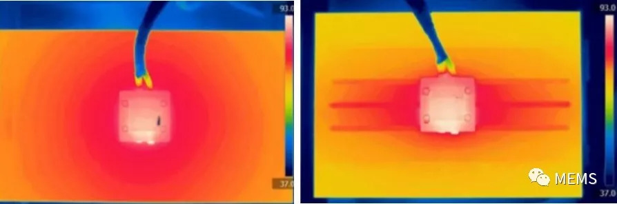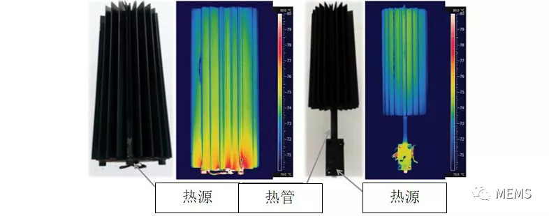 ►左图:热源和传统散热片直接接触,散热片温度呈现明显的热梯度分布;