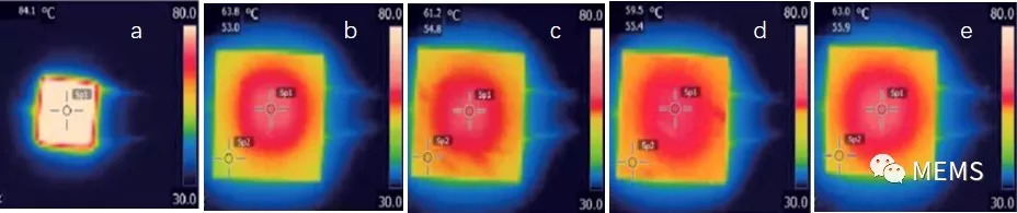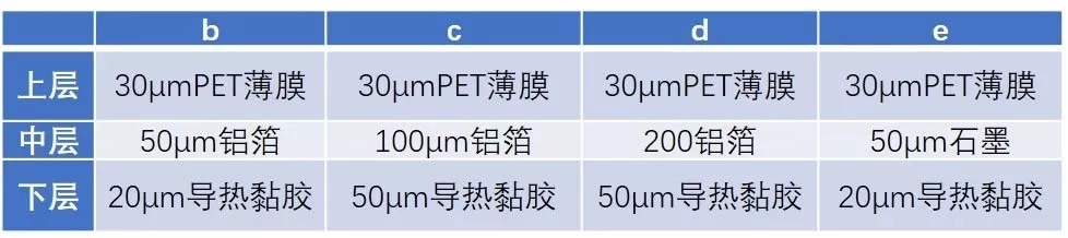 下图为不同规格的散热薄膜材料的筛选对比,其中a为对照组,热源不做任何散热措施,b~d热像图所用散热材料从上到下的微观分层为: