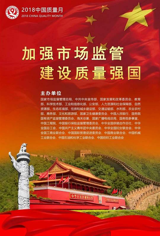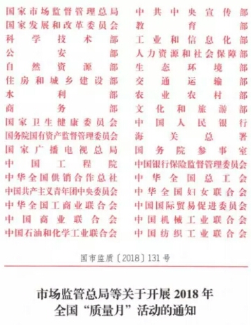 2018年9月,市场监管总局联合中共中央宣传部、教育部、工业和信息化部、银保监会、全国总工会、共青团中央、机械工业联合会等共34个部门,以“加强市场监管 建设质量强国”为主题,共同部署开展2018年全国“质量月”活动。