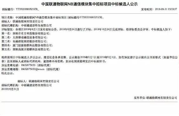有五家企业成为中国联通物联网NB通信模块集中项目的候选人。