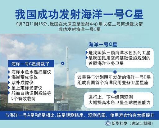9月7日11时15分,海洋一号C卫星搭载长征二号丙运载火箭于太原卫星发射中心成功发射。截至9月11日,“海洋一号 C”卫星平台与星上5个载荷全部开机且运行正常,图像数据接收成功。下一步,将对卫星进行为期半年的在轨测试。
