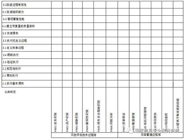 风险评估服务过程能力等级分为5级,由1级到5级递增。每个级别包含了几个公共特征,每个公共特征又包含若干个通用实施。通用实施是适用于所有过程的活动,是过程方面的管理,度量和制度化方面陈述。这些通用实施可在过程能力的评定中用于确定任何过程的能力。