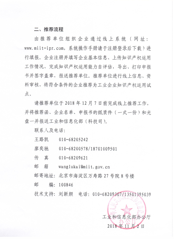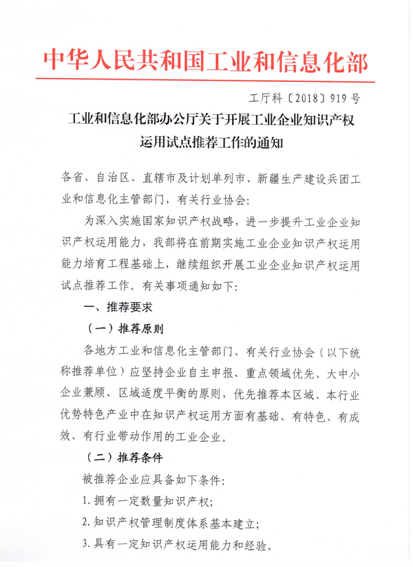 工信部办公厅关于开展工业企业知识产权运用试点推荐工