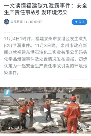 截至8日17时,泉港区医院陆续接诊来自南埔镇、后龙镇沿海一带的52名疑似接触碳九泄漏的群众。此类患者的主诉为“接触刺激性气体后身体不适”,其主要症状为头晕、恶心、呕吐、咽部不适。其中门诊就诊42名,留院观察10名。目前,9名患者症状较入院前有明显好转;另1名患者在事发水域溺水,出现吸入性肺炎,已从ICU(重症监护病房),转入普通病房,病情稳定。