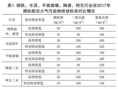 表1为钢铁、水泥、平板玻璃、陶瓷、砖瓦行业在2017年提标前后排放标准的对比情况。