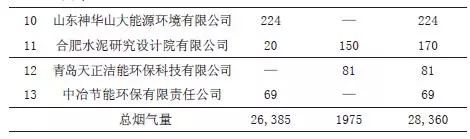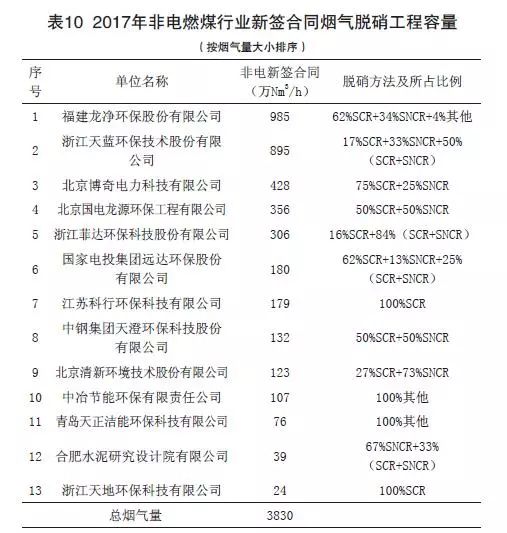 表10给出了参与调查各会员企业2017年新签合同非电燃煤烟气脱硝工程处理烟气量情况,不包括历史累计烟气量。截至2017年底,参与调查企业的全国非电燃煤新签合同脱硝工程总烟气量为3830万Nm3/h。