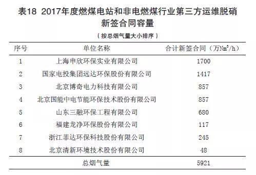 表17和表18给出了2017年各会员企业燃煤电站和非电燃煤行业新签合同第三方运维脱硫脱硝工程总处理烟气量情况。从调查结果可知,2017年各单位新签第三方运维脱硫工程总烟气量为11,732万Nm3/h;2017年各单位新签第三方运维脱硝工程总烟气量为5921万Nm3/h。