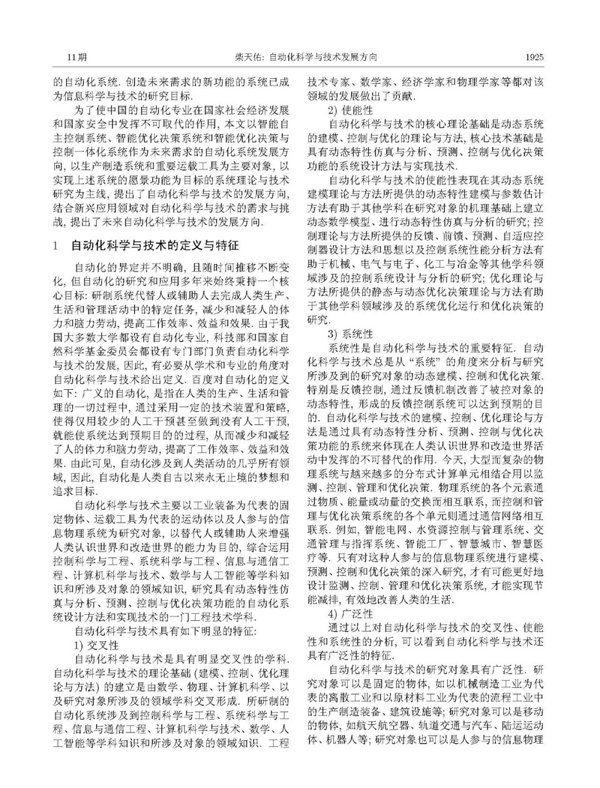 自动化科学与技术主要以工业装备为代表的固定物体、运载工具为代表的运动体以及人参与的信息物理系统为研究对象, 以替代人或辅助人来增强人类认识世界和改造世界的能力为目的, 综合运用控制科学与工程、系统科学与工程、信息与通信工程、计算机科学与技术、数学与人工智能等学科知识和所涉及对象的领域知识, 研究具有动态特性仿真与分析、预测、控制与优化决策功能的自动化系统设计方法和实现技术的一门工程技术学科.