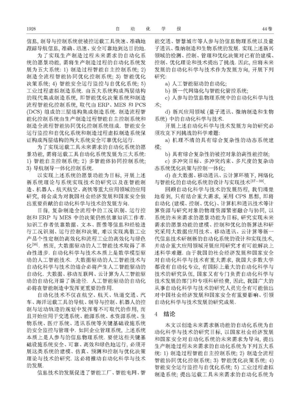 摘要:本文结合中国自动化科学与技术的发展状况和中国绝大多数大学设有自动化专业的现状, 借鉴自动化科学与技术发展历程中的成功经验, 结合国家社会经济发展和国家安全对自动化系统的未来需求, 以生产制造系统、重要运载工具和人参与的信息物理系统为主要对象, 以自动化系统的发展方向— 智能自主控制系统、智能优化决策系统和智能优化决策与控制一体化系统的愿景功能为目标, 以研究实现愿景功能的建模、控制与优化新算法和新的自动化系统的设计方法和实现技术以及结合重大应用领域开展的应用研究为主线, 提出了自动化科学与技术的发展方向, 并结合新兴应用领域对自动化科学与技术的需求与挑战, 提出了未来自动化科学与技术的发展方向.