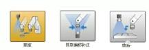 图1所示的三种工作方式称为固定相机模式,即相机安装在设备机架上,不随机器人的运动而运动,自左至右又依次分为抓取工况、抓取偏移纠正工况和放置工况。其中抓取工况,相机对传送过来的来料进行拍摄和粗定位,将定位信息传输给机器人以便机器人根据定位信息抓取来料,如此可降低对工位间传送机构准确性的要求,确保抓取的稳定性;抓取偏移补正工况可通过设置在机械臂另一侧的下相机对工件进行二次精准定位,极大程度上消除来料偏差,确保能有针对性地对每个来料进行加工;放置工况内容涵盖广泛,可以是简单的放置,亦可以是贴合、安装等,即使用相机定位最终的目标位,结合前述两种工况,真正做到针对每个工件有的放矢。