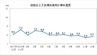 2018年12月份,规模以上工业增加值同比实际增长5.7%(以下增加值增速均为扣除价格因素的实际增长率),增速比11月份加快0.3个百分点;环比增长0.54%。2018年全年,规模以上工业增加值同比增长6.2%,增速较1-11月份回落0.1个百分点。