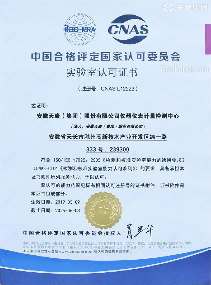 近日,经过紧张而复杂的审核程序,安徽天康(集团)股份有限公司仪器仪表计量检测中心顺利通过中国合格评定国家认可委员会的文审和现场审核,并获得认证证书(证书编号:L12223)。