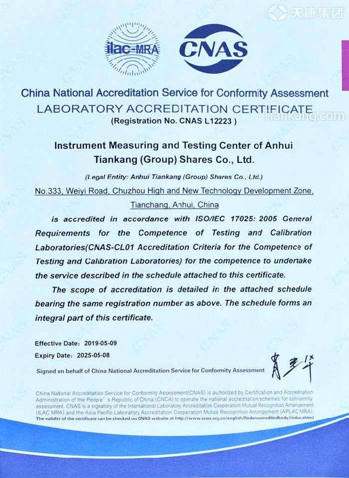 2016年6月,安徽天康集团光电缆检测中心就获得CNAS实验室认可证书,此次安徽天康集团仪器仪表计量检测中心获得CNAS实验室认可证书,表明了安徽天康集团的仪器仪表、光电缆检验检测中心具备了在认可范围内与国际互认的检测能力,具有在国际范围内开展校准的第三方检测资格,标志着天康集团仪器仪表、光电缆检验检测中心的管理水平、技术水平、整体实力均达到国际水平,所出具准确、可靠的检测报告也更有公信力,对产品的研发设计、生产制造、品质保障等各方面将提供更强的技术支持,对提升安徽天康集团品牌价值、加强内部质量控制、增强产品的市场竞争力、促进对外贸易合作都具有积极影响。