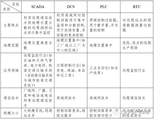 表 2 SCADA、DCS、PLC、RTU 的区别