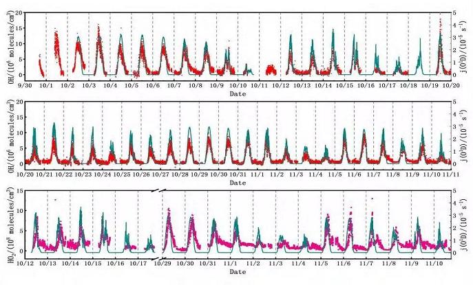 图3和图4分别为气体扩张激光诱导荧光技术系统和外场观测的HOx自由基浓度数据。由于白天OH自由基的主要来源是臭氧光解,故而可同步测量臭氧的光解速率j(O1D)。未来将进一步发展基于气体扩张激光诱导荧光技术的地基、机载、船载等多平台HOx/OH/ROx自由基探测系统,研究对象也逐渐过渡到自由基、反应中间体、反应参数和污染生成潜势的直接测量,逐步打破现有各种研究手段的界限,通过外场观测、烟雾箱模拟实验以及数值模拟,形成基于量化计算和数值模拟引导的外场反应动力学闭合研究。