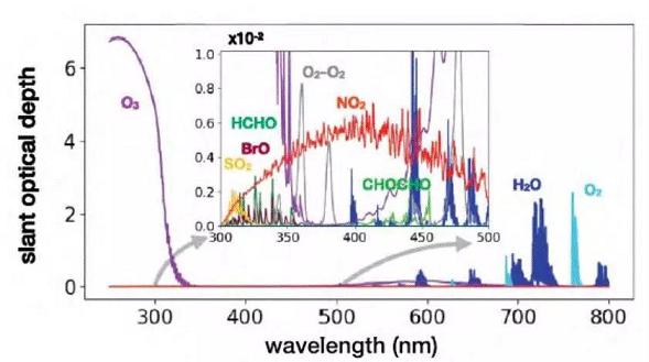 在120公里以下的高空中,除地球大气的主要组成—氮分子、氧分子和惰性气体,大气中还存在着微量痕量气体。这些痕量气体虽体积浓度小(不到万一之一),但能对全球大气环境及生态产生重大的影响,例如温室效应、光化学烟雾、臭氧层破坏等。光学/光谱学方法利用光学中的吸收、发射、散射以及大气辐射传输等方法,通过建立特征因子指纹光谱数据库和定量解析算法,获取痕量气体的特性,可用于空气质量、固定和流动污染源自动监测。图1为部分痕量气体在紫外—可见波段的吸收光谱。对于常规气体,目前的空气质量监测系统除采用单点测量外,主要利用各种光学技术路线:如针对SO2、NO2、O3及THC、CH4、NMHC、BTX等污染物,差分光学吸收光谱技术(Differential Optical Absorption Spectroscopy,DOAS)利用气体分子的吸收特性来鉴别成分,并根据窄带吸收强度反演出微量气体的浓度,采样代表性较传统的点式有较大的改善,有利于对空气质量的表征;针对温室气体CO2,光腔衰荡光谱技术(Cavity Ring-Down Spectroscopy,CRDS)利用相对较窄的吸收窗口,可以避免其他组分干扰,实现较高精度检测;针对光化学反应中起关键作用的CO,利用可调谐半导体激光吸收光谱技术(Tunable Diode Laser AbsorptionSpectroscopy,TDLAS)的波长调谐特性,用单一窄带的激光频率扫描通过气体分子的一条或者几条气体特征吸收线,获得被测气体的特征吸收光谱范围内的吸收光谱,实现CO的定性或定量分析;或者利用光声光谱技术,根据气体吸收—强度随时间变化的光束而被加热时所引起的一系列声效应,来获得气体的浓度。