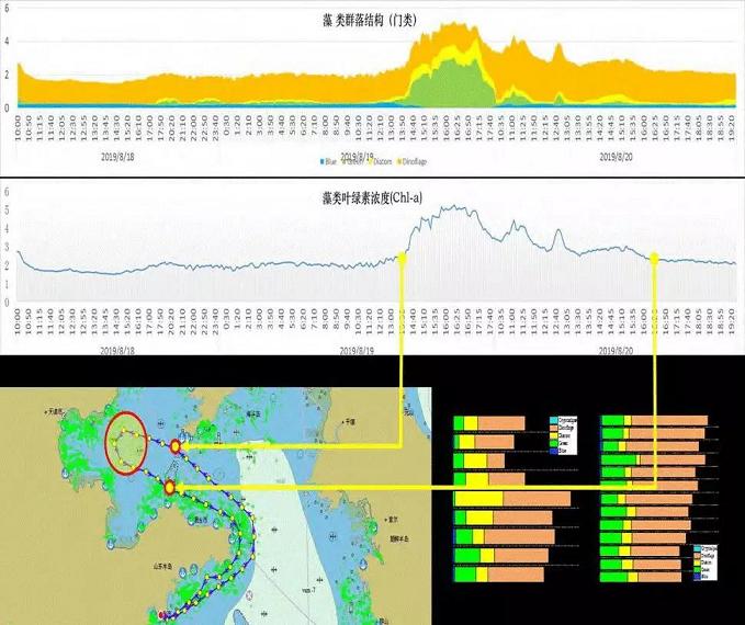 图8为2019年中科院自行研制的海洋生物要素在线监测仪在青岛南姜码头试验,成功获取了藻类群落结构、叶绿素浓度等数据以及典型海域生物要素分布特征。