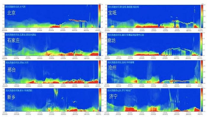 在2017年9月实施的“大气重污染成因与治理攻关项目(总理基金)”中,中国科学院安徽光学精密机械研究所联合国内其他院所高校在京津冀地区建立了16个地基立体观测站点,开展了基于激光雷达等仪器的颗粒物立体探测研究。图6为2017年12月25-30日激光雷达观测的一次污染过程。12月27日下午京津冀地区污染物主要分布在1km以下,28日高空1km污染团与近地面污染混合,污染过程持续,28日夜间-29日凌晨,混合层高度降低,局地污染加剧至30日,30日下午混合层抬升,风速增大,扩散条件转好,污染消散。地基单点固定式激光雷达的长期观测十分必要,对于研究和统计分析一些重要大气成分的变化规律具有重要价值。但车载、船载和机载式的可移动式平台,机动性强,更适合应急和特殊环境的观测,如机载式和船载式可以在海洋上空观测,其观测资料更能代表区域性大气成分的分布。总之,多平台、多类型雷达的联合运用,在一些区域性乃至全球性大气辐射和环境研究的对比实验中发挥了重要作用。