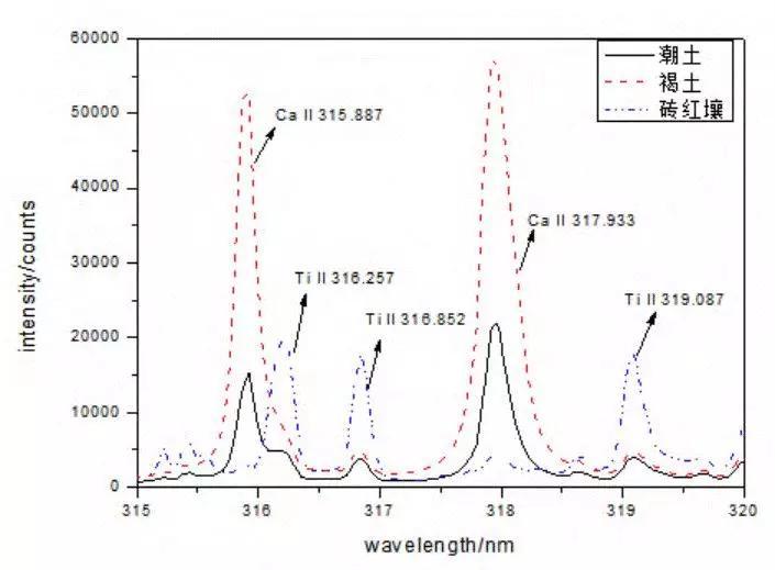 不同类型的土壤其组成的元素在含量上具有较大的差异,即使是同一类型的土壤,其组成元素也会存在微小的差异。图10是褐土、潮土和砖红壤三类土壤在315-320nm光谱范围内的特征谱线,其中褐土的Ca特征谱线最强,而砖红壤的Ti特征谱线强度最大。从这些土壤的LIBS光谱中可明显体现出其元素含量的差异。