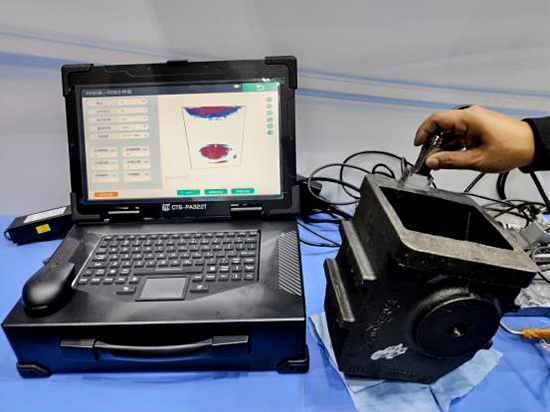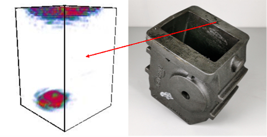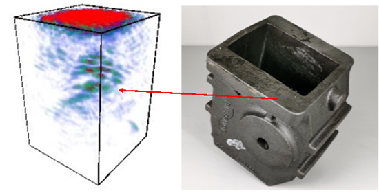 针对异型的壳体铸件, 相控阵全聚焦实时3D超声成像系统CTS-PA322T可自定义全聚焦模型,能够实现异型材料的有效全聚焦(TFM)检测.现我司运用相控阵全聚焦实时3D超声成像系统CTS-PA322T对壳体铸件(材质QT400-18)进行检测: