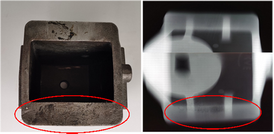 根据壳体铸件的检测成像图可知,在壳体铸件的前侧可直观地看出,在壳体铸件前侧的中部位置呈现出由集中的空隙和小点组成的不致密组织,并以空隙为主。初步判断壳体铸件的前侧存在疏松类缺陷,壳体铸件的后侧不存在缺陷。