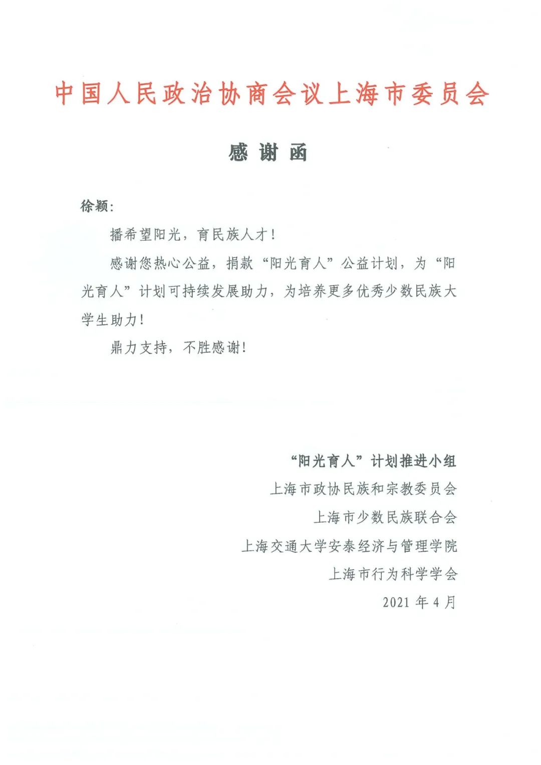 上海北分于近日参加了由上海市政协民宗委、市民族联和上海交大安泰经管学院联合组织的第十四期”阳光育人“少数民族大学生助学行动,公司原董事长徐颖先生代表并出席了签约仪式。