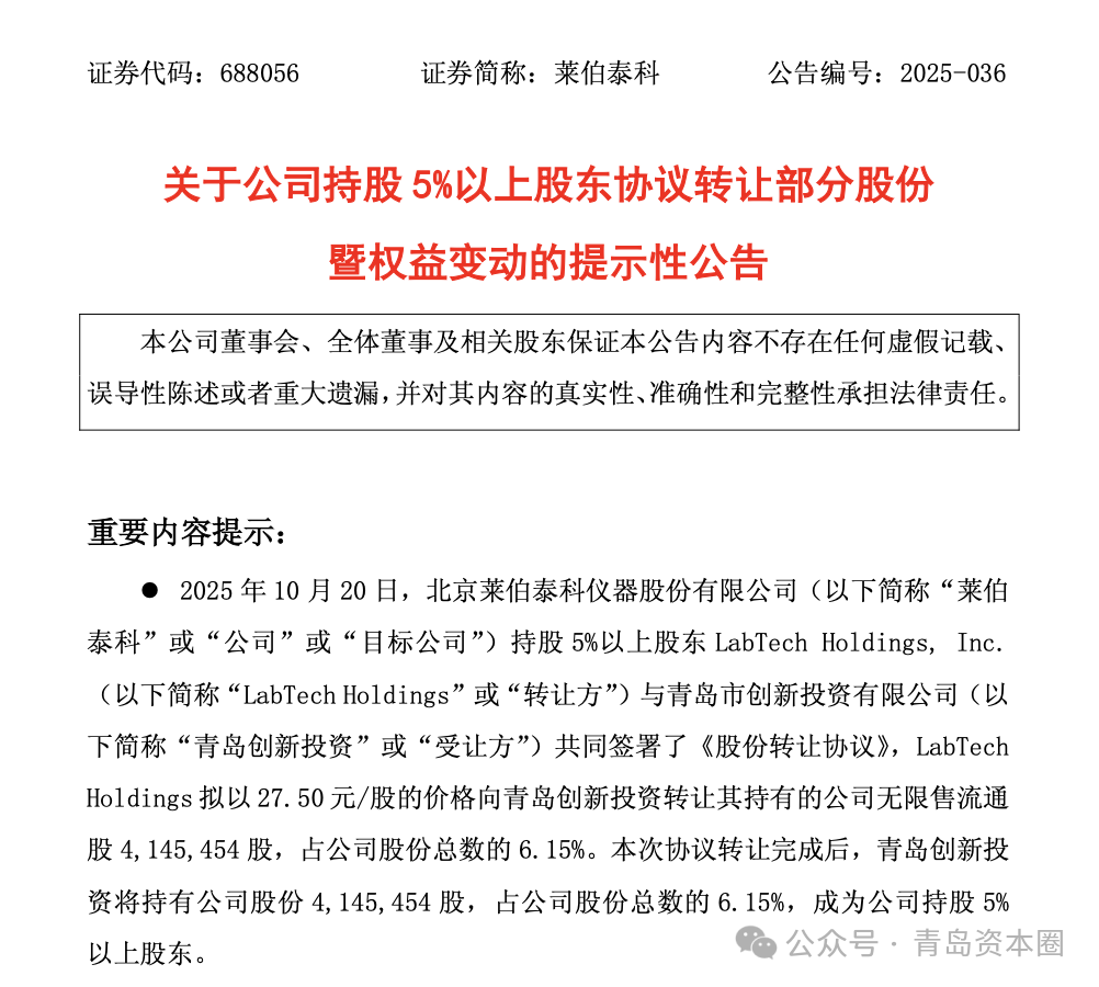 10月21日,北京莱伯泰科仪器股份有限公司(股票代码:688056,简称 “莱伯泰科”)发布公告称,公司股东LabTech Holdings, Inc.(以下简称 “LabTech Holdings” )与青岛市创新投资有限公司共同签署了《股份转让协议》,LabTech Holdings拟以27.50元/股的价格向青岛创新投资转让其持有的公司无限售流通股414.55万股,占公司股份总数的 6.15%。本次协议转让完成后,青岛创新投资将持有公司股份414.55万股,占公司股份总数的6.15%,成为公司持股5%以上股东。