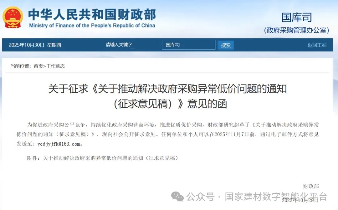 10月28日,财政部发布关于征求《关于推动解决政府采购异常低价问题的通知(征求意见稿)》意见的函。