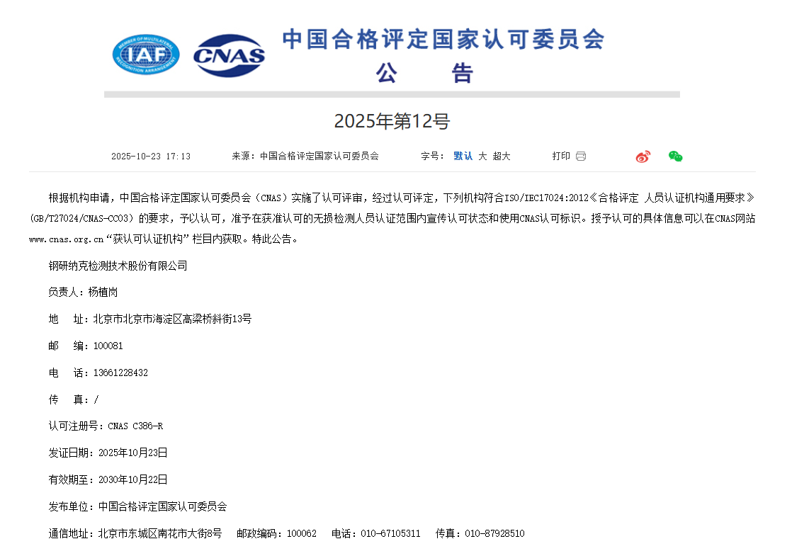 2025年10月23日,中国合格评定国家认可委员会(CNAS)正式发布 2025 年第 12 号公告:“关于授予钢研纳克检测技术股份有限公司人员认证机构基本认可制度认可资格的公告”,标志着钢研纳克作为我国首个试点的无损检测人员认证机构获得CNAS认可。