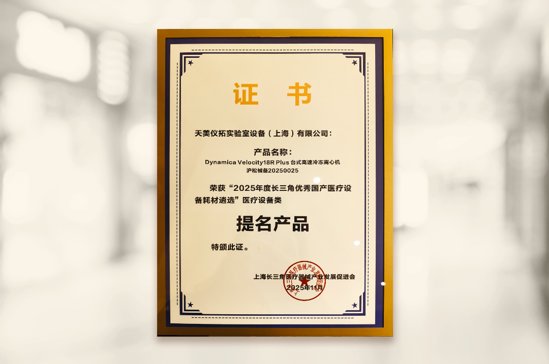 天美旗下Dynamica Velocity18R Plus台式高速冷冻离心机从众多国产设备中脱颖而出,荣获“2025年度长三角优秀国产医疗设备耗材遴选”医疗设备类提名产品。