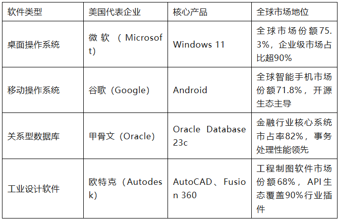 美国企业通过技术标准制定与生态构建形成双重垄断。微软凭借.NET框架与DirectX技术体系,构筑Windows的开发者护城河;甲骨文数据库以ACID特性与RAC集群技术,成为银行核心系统的“标配”;Synopsys的EDA工具链更是深度绑定全球半导体产业,形成“设计工具-制造工艺”的共生体系。欧洲企业在特定领域补充布局,如法国达索系统的CATIA软件垄断航空航天设计市场,德国西门子的PLM系统占据制造业数字化平台35%份额。