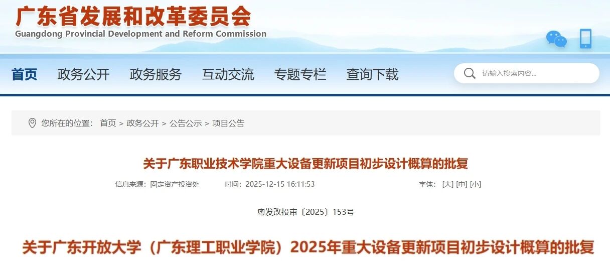 12月15日,广东省发展和改革委员会连续发布两项批复——“关于广东职业技术学院重大设备更新项目初步设计概算的批复”以及“关于广东开放大学(广东理工职业学院)2025年重大设备更新项目初步设计概算的批复”。根据批复,两所院校拟更新购置共142台(套)教学科研仪器设备,总投资14930万元。