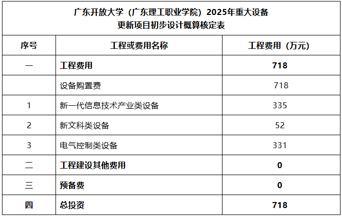 项目概算总投资718万元,均为设备购置费。项目建设资金由学校申请超长期特别国债及自筹解决。