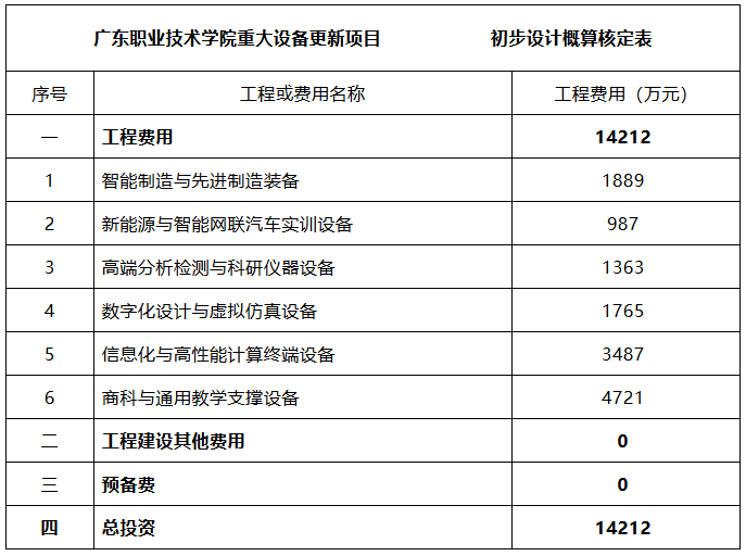 项目概算总投资14212万元,均为设备购置费。项目建设资金由超长期特别国债安排6792万元,其余资金由学校自筹解决。