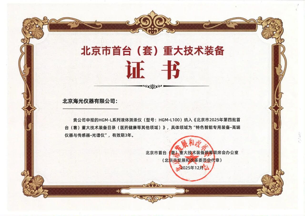 近日,北京市发展和改革委员会正式发布2025年北京市第四批首台(套)重大技术装备目录,海光公司自主研发的“HGM-L液体测汞仪”成功入选。这标志着该设备在技术创新、性能指标及市场应用前景方面获得了官方权威认可。