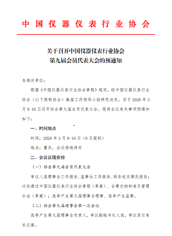 根据《中国仪器仪表行业协会章程》规定,经中国仪器仪表行业协会(以下简称协会)换届工作领导小组研究决定,定于2026 年3月8-10 日召开协会第九届会员代表大会。现将会议有关事项预通知如下: