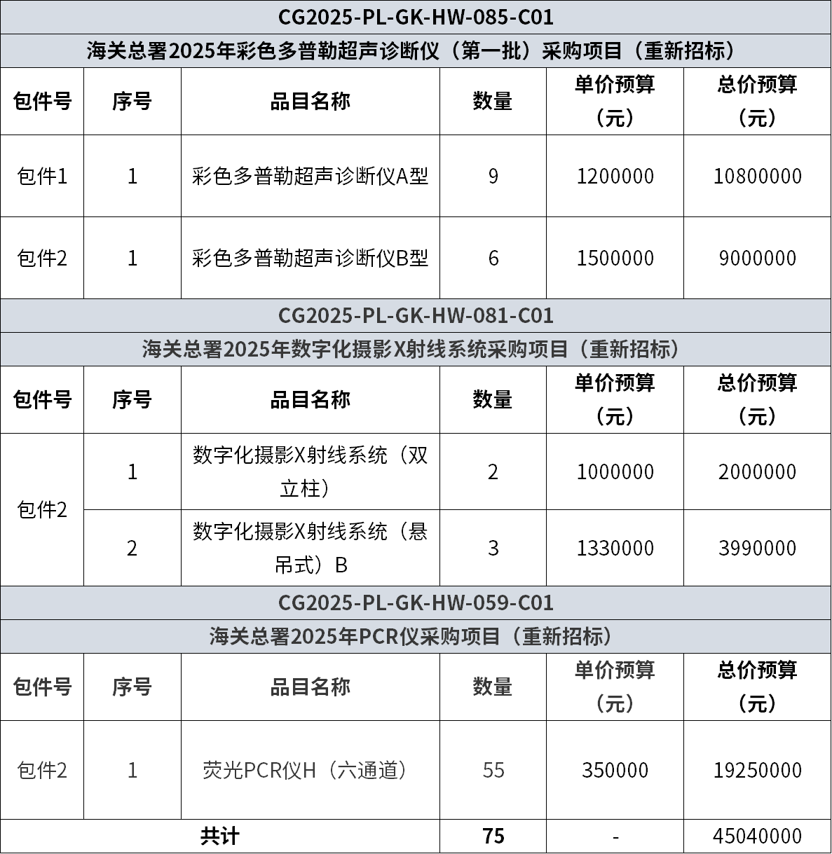 近日,海关总署物资装备采购中心发布多则公告,分别就“海关总署2025年数字化摄影X射线系统采购项目(重新招标)”“海关总署2025年PCR仪采购项目(重新招标)”“海关总署2025年彩色多普勒超声诊断仪(第一批)采购项目(重新招标)”进行国内公开招标采购。
