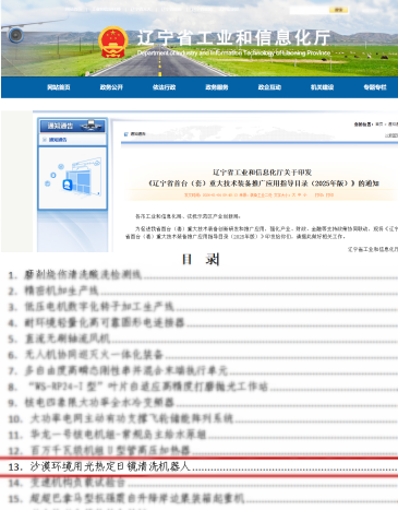 新年伊始,辽宁省工业和信息化厅正式印发《辽宁省首台(套)重大技术装备推广应用指导目录(2025年版)》。我院申报的《沙漠环境用光热定日镜清洗机器人》 项目经过严格评审,成功获得“首台(套)”重大技术装备认定,并被纳入省级推广应用名录。这是我院在高端装备研发与产业化应用领域取得的又一重要突破!