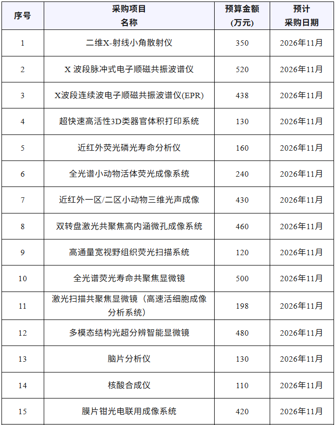 近期,湖南大学发布多项仪器采购项目,拟采购二维X-射线小角散射仪、X 波段脉冲式电子顺磁共振波谱仪、全光谱荧光寿命共聚焦显微镜、核酸合成仪、场发射透射电子显微镜、电感耦合等离子体质谱仪、超高分辨液相色谱质谱联用仪等仪器设备,预算总金额13641.8万元,预计采购时间2026年1月~11月。