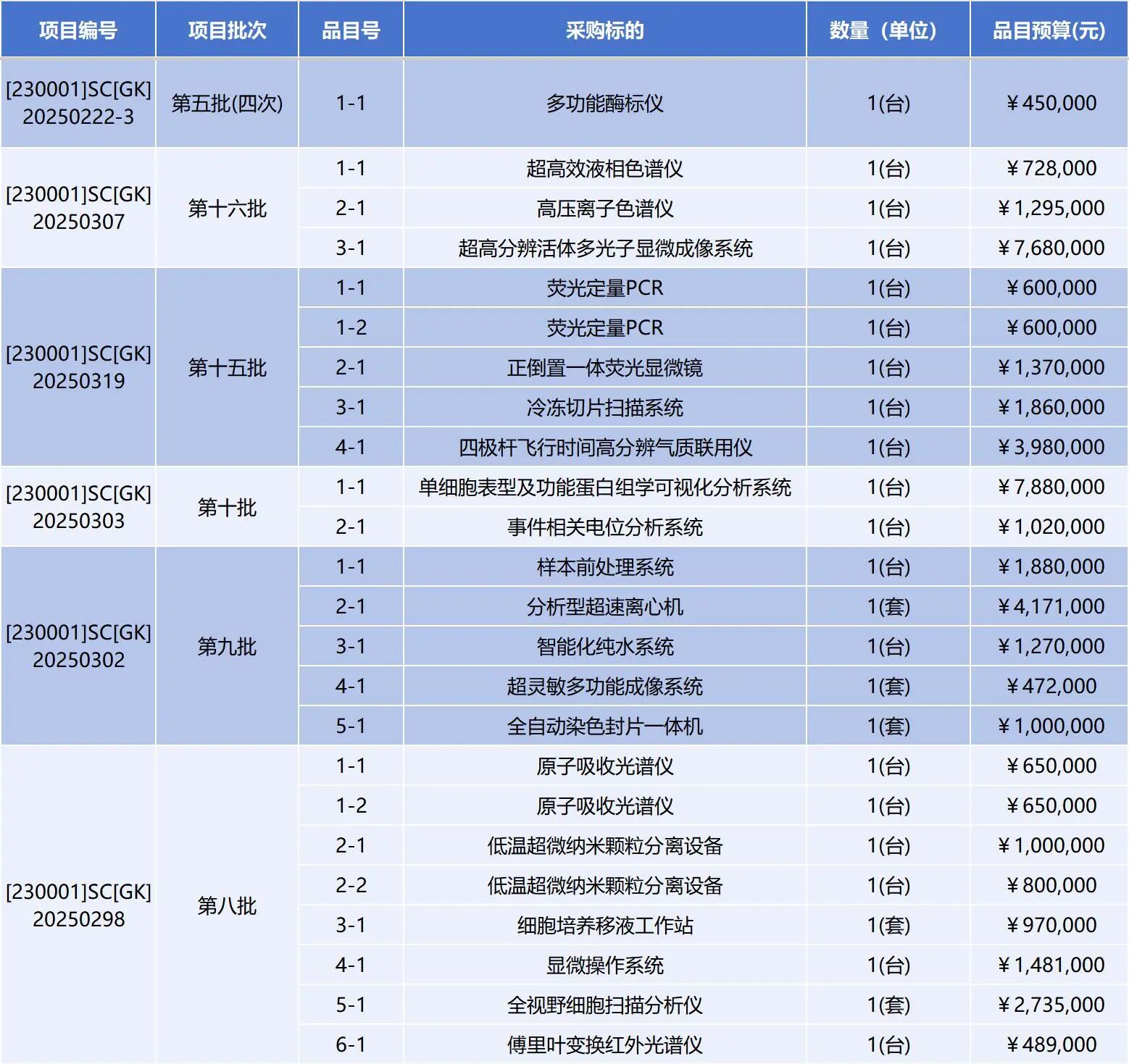 据统计,本次计划采购的仪器设备总预计招标金额超过8200万元,涵盖四极杆飞行时间高分辨气质联用仪、高效液相色谱仪、研究级倒置荧光显微镜、倒置多功能荧光成像系统、荧光定量PCR仪、高压离子色谱仪、多功能酶标仪、傅里叶变换红外光谱仪、原子吸收光谱仪、超灵敏化学发光成像仪、超高频高分辨率小动物超声成像系统、小动物活体三维成像系统、超灵敏多功能成像系统、单细胞表型及功能蛋白组学可视化分析系统等共计40项高端科研设备。