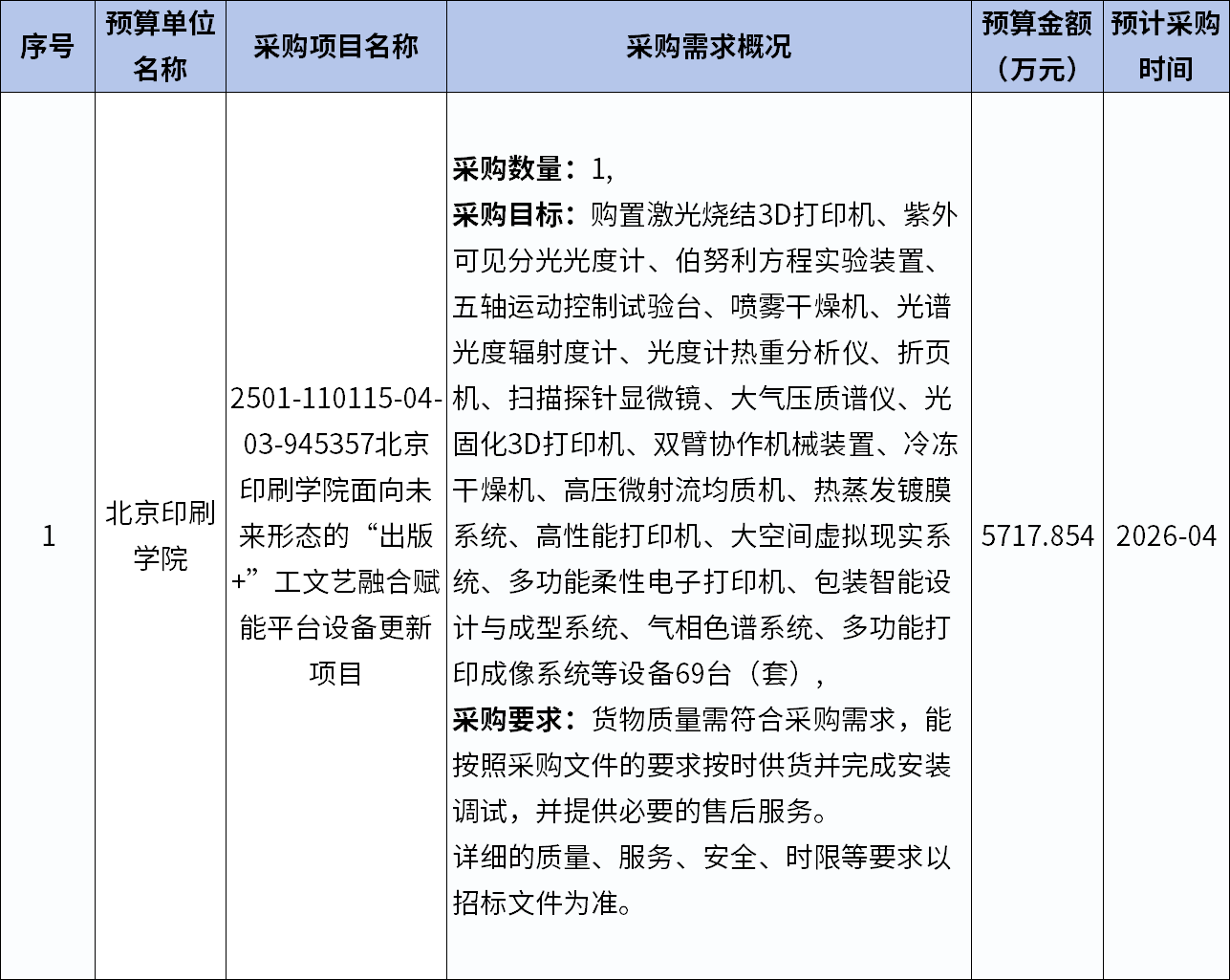 北京印刷学院面向未来形态的“出版+”工文艺融合赋能平台设备更新项目公开,计划购置激光烧结3D打印机、紫外可见分光光度计、伯努利方程实验装置、五轴运动控制试验台、喷雾干燥机、光谱光度辐射度计等69台(套)设备,预算金额5717.854万元,预计2026年4月采购。