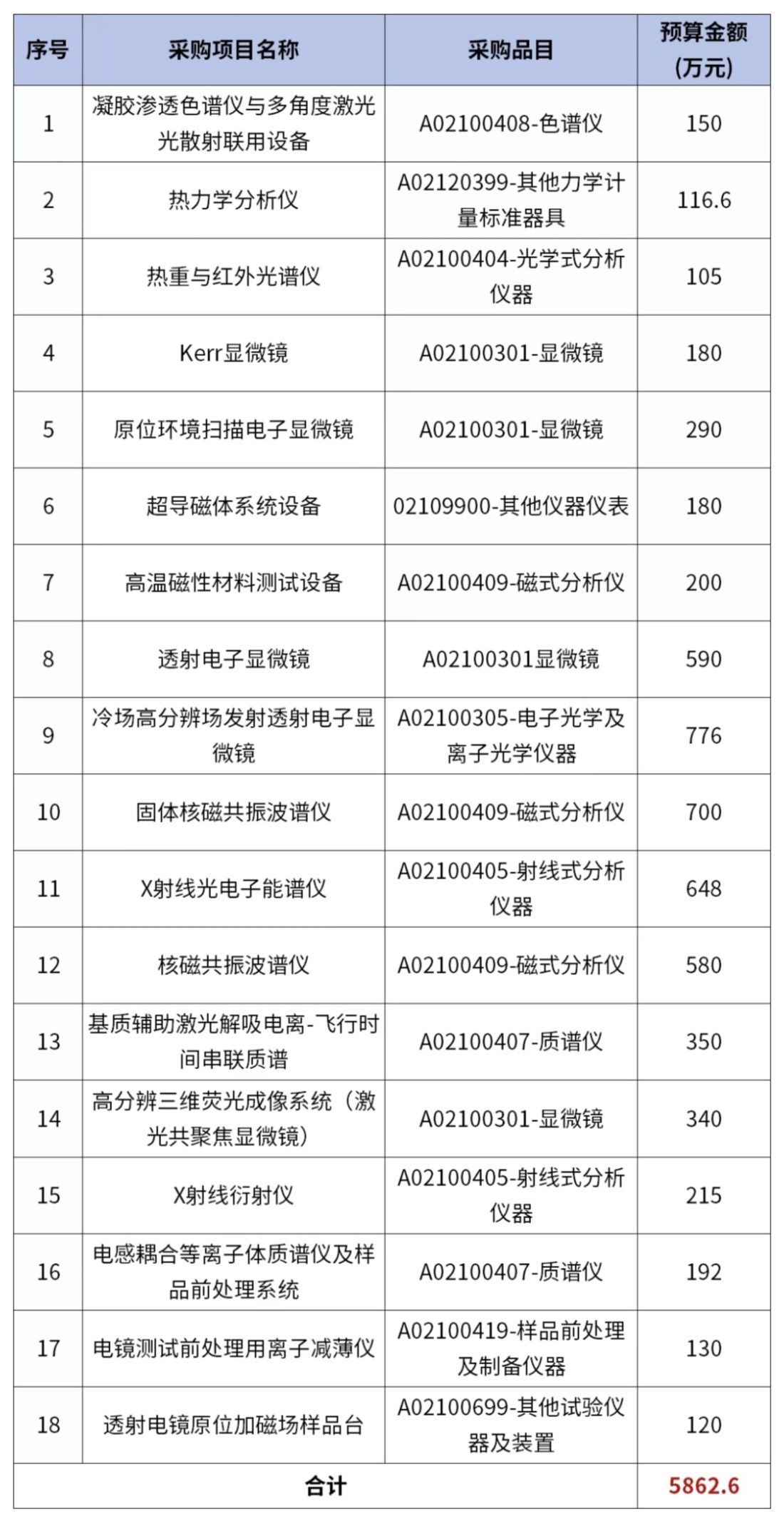 东华大学近日发布多项仪器设备采购计划,拟采购凝胶渗透色谱仪与多角度激光光散射联用设备、热力学分析仪、热重与红外光谱仪、Kerr显微镜、原位环境扫描电子显微镜、超导磁体系统设备、高温磁性材料测试设备等,项目预算总额5862.6万元,采购项目均计划于2026年3月实施。