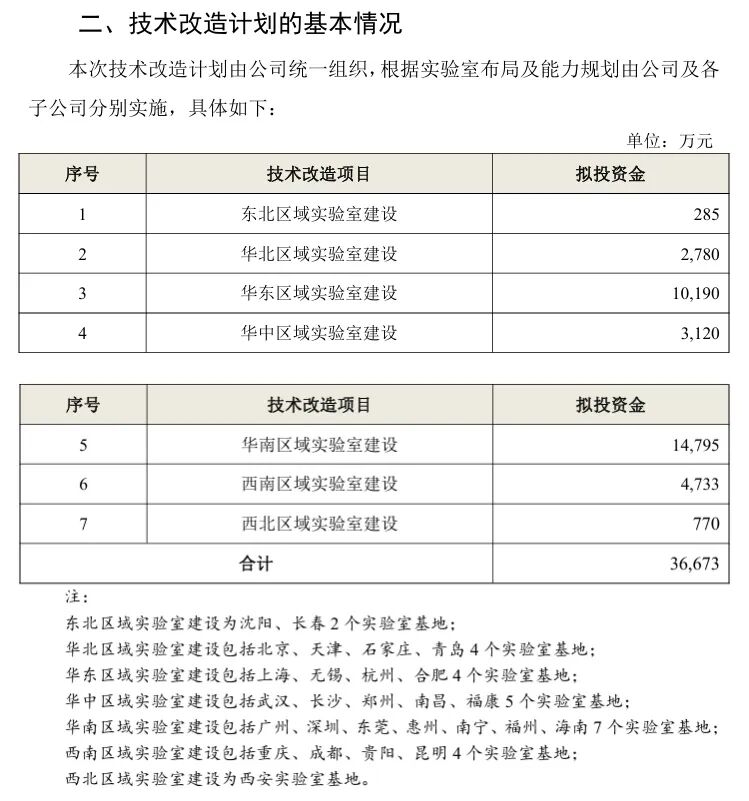 本次技术改造计划由公司统一组织,根据实验室布局及能力规划由公司及各子公司分别实施,在全国七大区域(东北、华北、华东、华中、华南、西南、西北)的合计27个实验室基地分别实施。