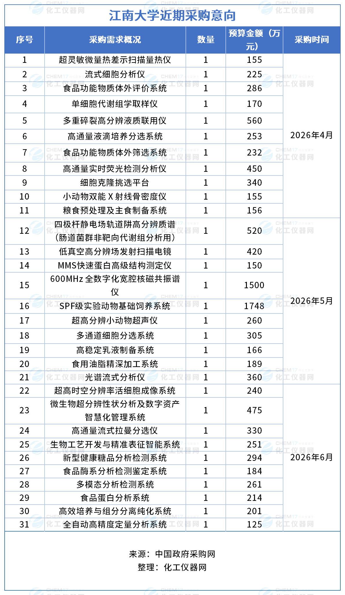 近期,江南大学发布多项仪器采购意向,采购预算金额11175万元,涉及仪器设备包括超灵敏微量热差示扫描量热仪、流式细胞分析仪、食品功能物质体外评价系统、单细胞代谢组学取样仪、多重碎裂高分辨液质联用仪、高通量液滴培养分选系统、食品功能物质体外筛选系统等。预计采购时间2026年4月-6月。