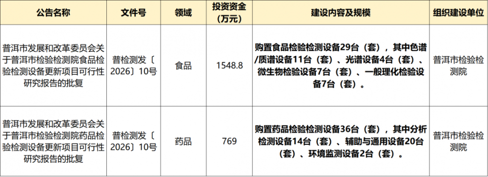 近日,普洱市发展和改革委员会正式批复普洱市检验检测院食品、药品两大领域检验检测设备更新项目可行性研究报告,两个项目总投资达2317.8万元,将通过超长期特别国债与单位自筹相结合的方式,全面提升区域食品药品检验检测技术水平,筑牢民生安全底线。
