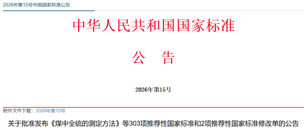 国家市场监督管理总局(国家标准化管理委员会)批准《煤中全硫的测定方法》等303项推荐性国家标准和2项推荐性国家标准修改单,现予以公告。