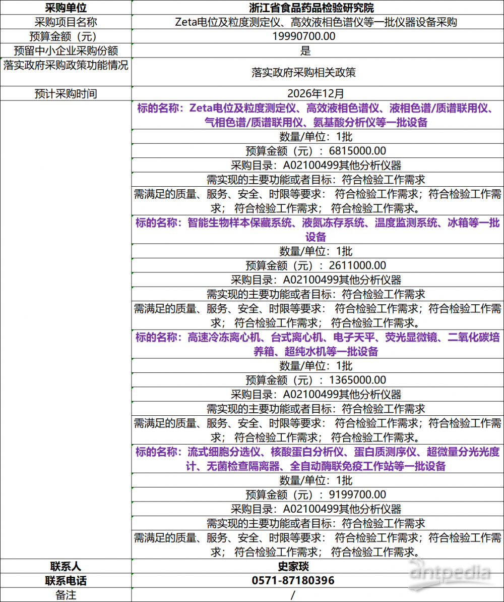 4月21日,浙江省食品药品检验研究院发布 2026年8月-12月政府采购意向,预计12月份将采购包括 Zeta 电位及粒度测定仪、高效液相色谱仪、液相色谱 / 质谱联用仪、气相色谱 / 质谱联用仪、氨基酸分析仪、高速冷冻离心机、台式离心机、电子天平、荧光显微镜、二氧化碳培养箱、超纯水机等共计 4 批仪器设备,采购预算总金额为 1999.07 万元。详情如下:为便于供应商及时了解政府采购信息,根据《财政部关于开展政府采购意向公开工作的通知》(财库〔2020〕10 号)等有关规定,现将浙江省食品药品检验研究院 2026年8月至12月采购意向公开如下: